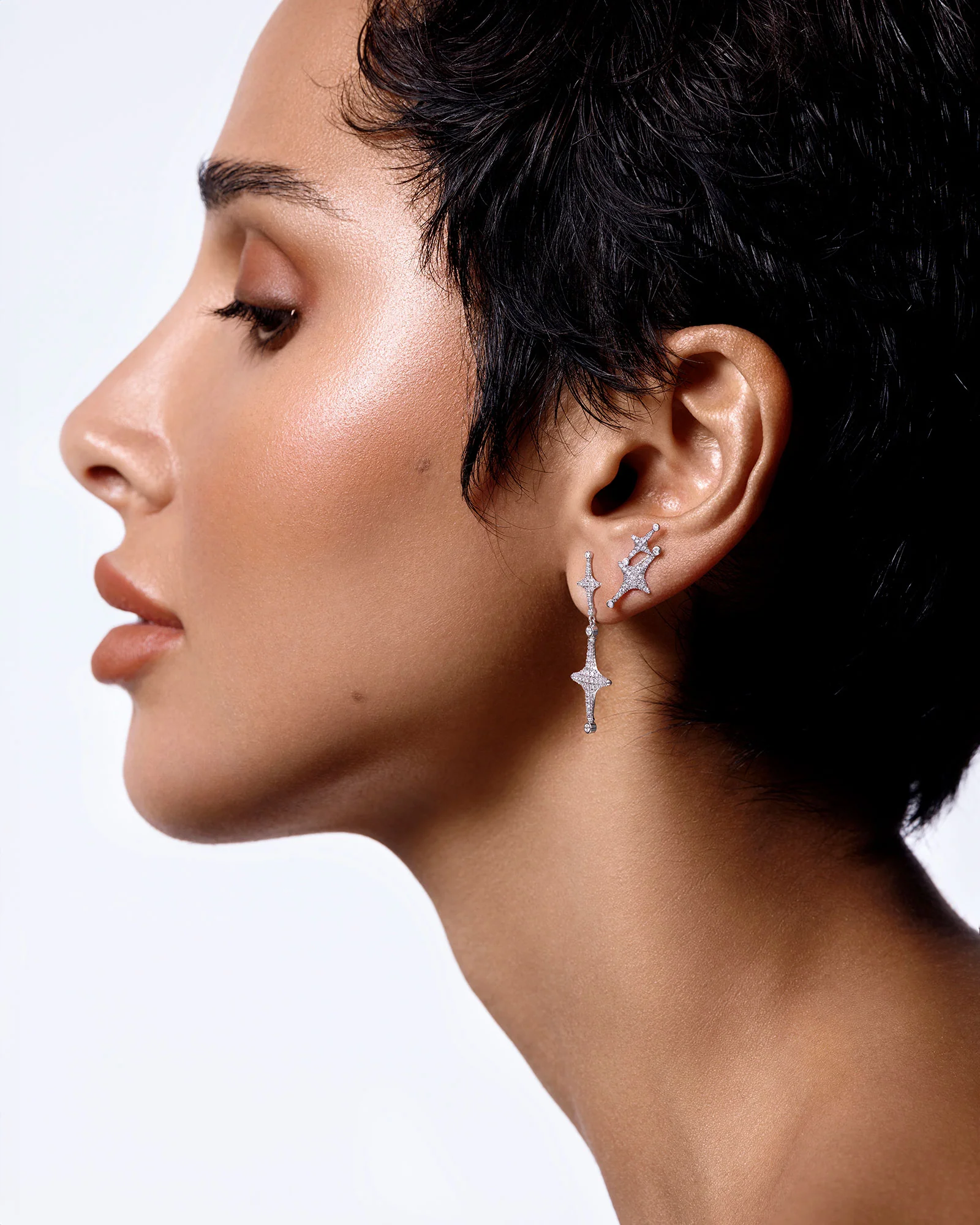 The Aurora Apogée Twin Earrings pair two of OFA’s signature smotifs, pavé-set in natural diamonds on 18k white gold. A modern design that brings dimension and sparkle.