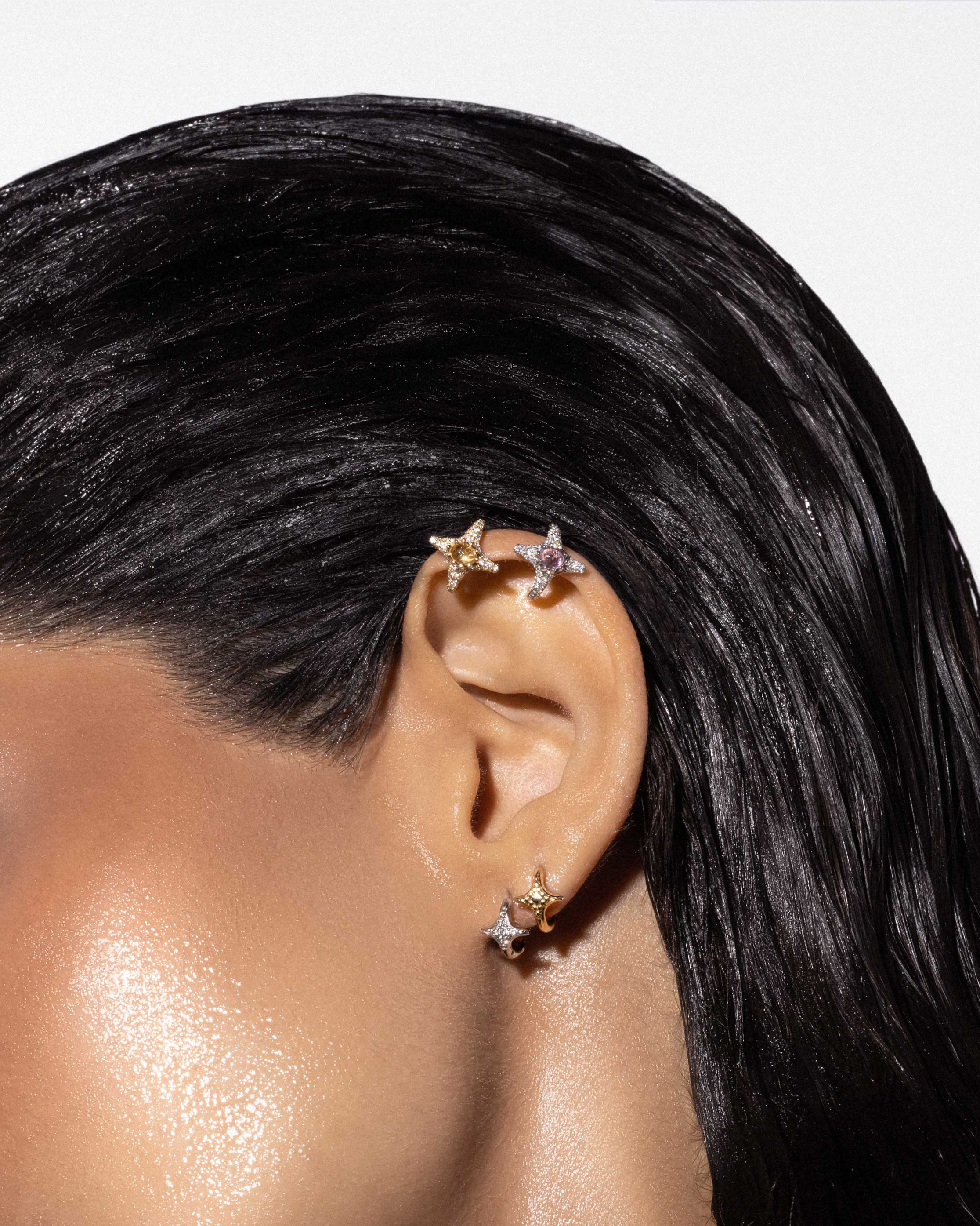 The Luna Mini Hoops feature a star-shaped design with intricate granulation. Available individually or as a pair, these hoops add a touch of detail and texture, perfect for creating your own unique combination with other items from the Selene collection.